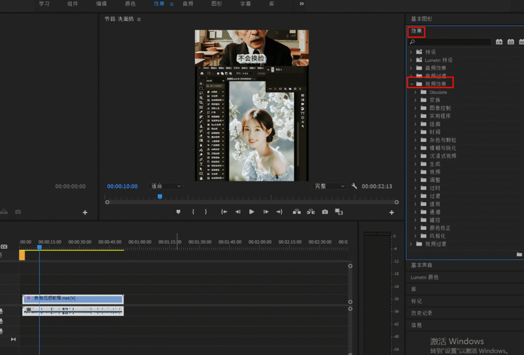 ③将滤镜拖动到视频素材上,进入“效果控件”面板进行色彩调整。