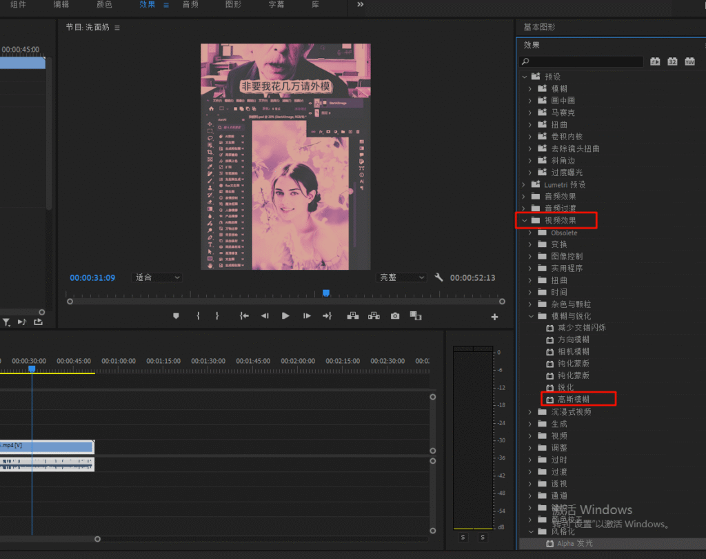 ①在“效果”面板中,找到“高斯模糊”或“径向模糊”滤镜,并将其拖动到视频素材上。